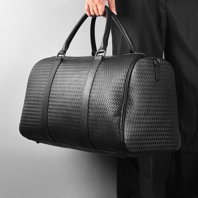 This travel bag is suitable for both men and women. It's a large tote Boston bag made of genuine leather with cow skin embossed design. The luxury suitcase is on promotion and makes a great choice for your luggage.